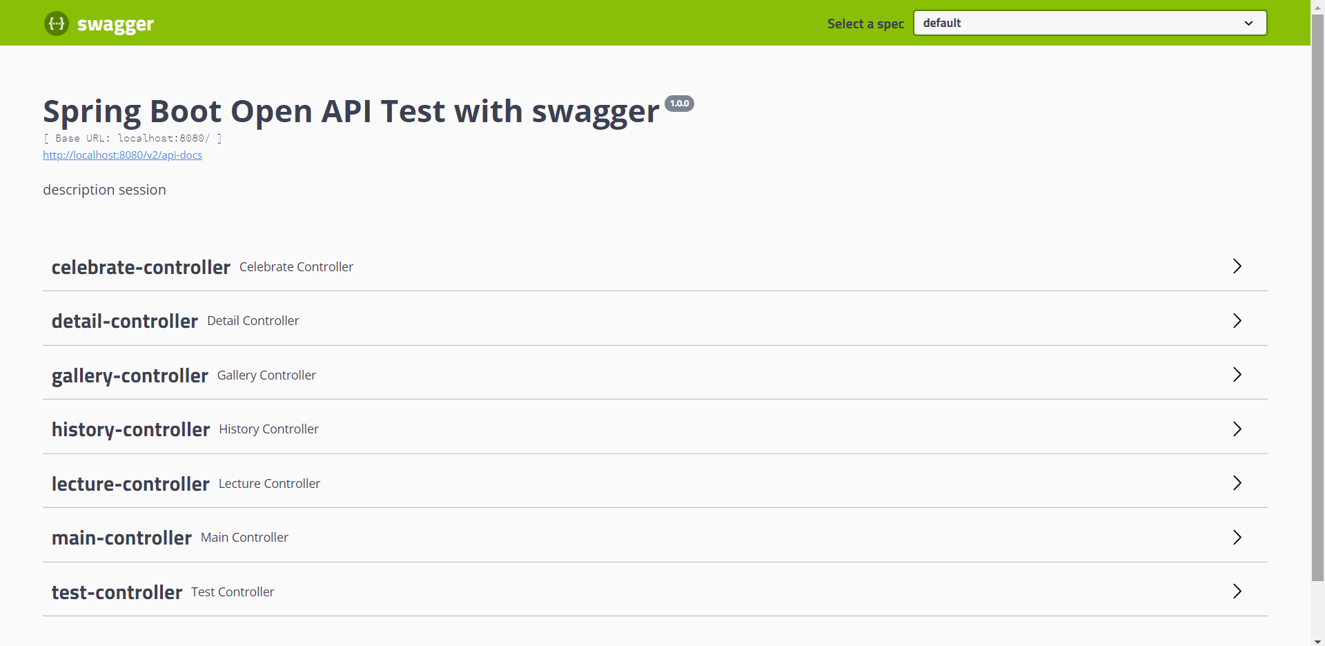Docket 메소드에서는 명세페이지에 대한 간단한 설정을 한다. apis메소드에는 basePackage를 설정한다. 최종적인 페이지는 다음과 같다.