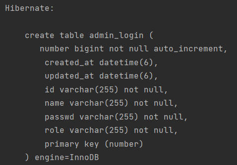 클래스 앞에 @Entity 어노테이션이 있다면, 이는 Spring Data JPA에서 이 클래스를 하나의 엔티티로 취급하여 엔티티 매니저 객체에서 해당 클래스를 관리한다. Entity는 각 데이터베이스의 Table과 매칭되며, @Table 어노테이션에서 Database에서 저장될 Table 명을 설정할 수 있다. 해당이름의 테이블이 없다면 Entity Class에 맞게 테이블이 생성되며, 만약 Table이 있다면 앞에 설정된 값(spring.jpa.hibernate.ddl-auto)에따라 테이블이 처리된다. 이렇게 해당 Entity를 설계하고 어플리케이션을 실행하면 다음과 같은 Hibernate 쿼리문을 볼 수 있다.