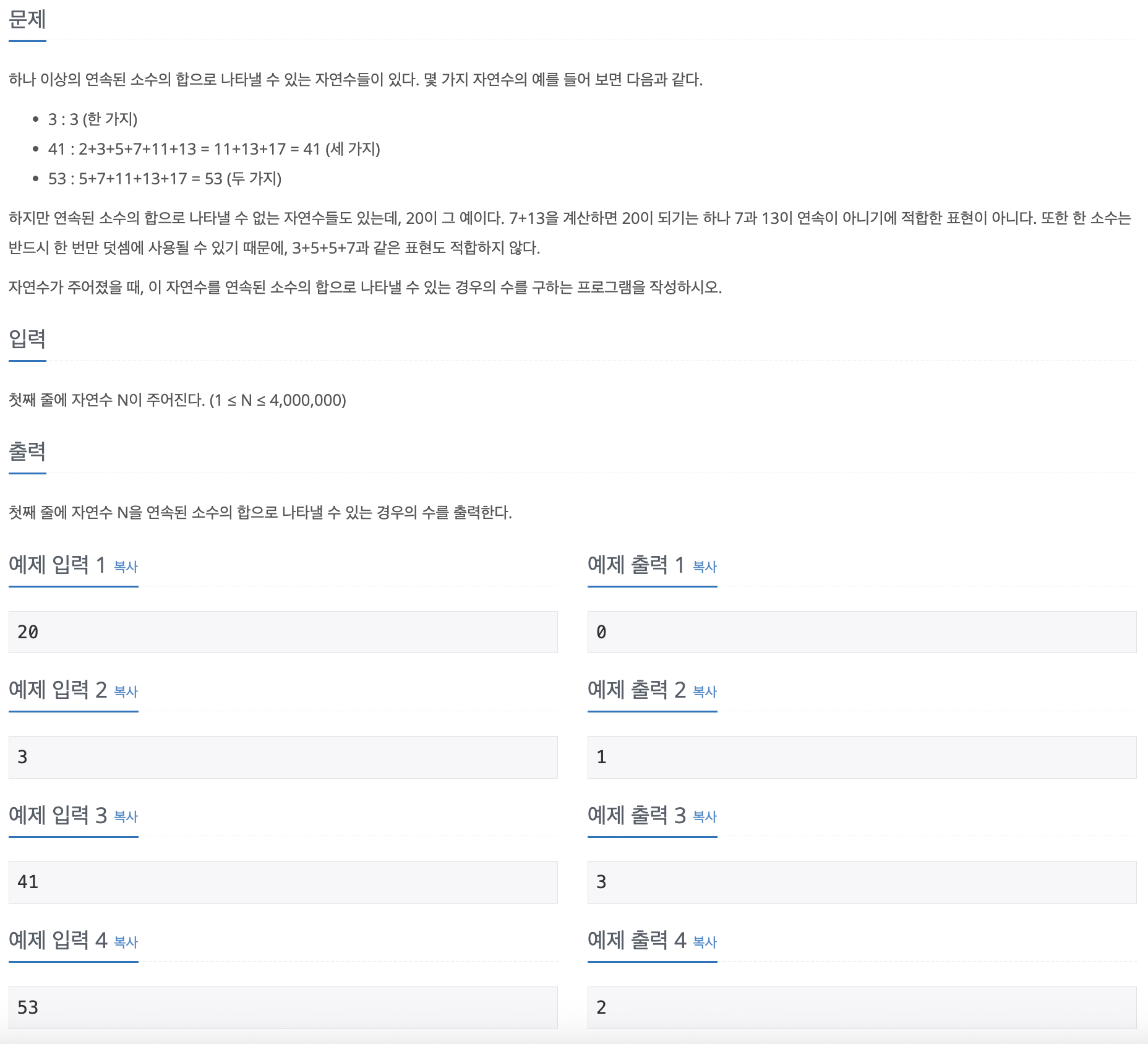 오랜만에 풀어본 정수론 문제이다. 사실 풀이 방법은 투포인터에 더 가깝다... 소수를 구하는 방법인 에라토스테네스의 체가 기억이 잘 나지 않았지만 그래도 어찌저찌 기억해서 풀었다. 아마 최선의 방법이 아니었을 수 있다.