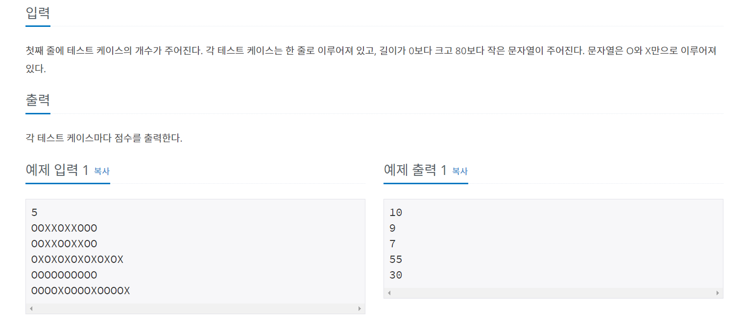 여기서 중요한 점은 O가 연속될 수록 점수가 중첩된다는 점과 X가 나오면 다음 부터 다시 1을 더해야 한다는 점이다. 다시 생각하면 O가 나올때마다 계속 점수를 중첩시키는 변수를 만들었다가 X를 만나면 초기화 시켜야 된다로 해석할 수 있을 것 같다. 그렇게 코드를 짜면 다음과 같은 코드가 나온다.