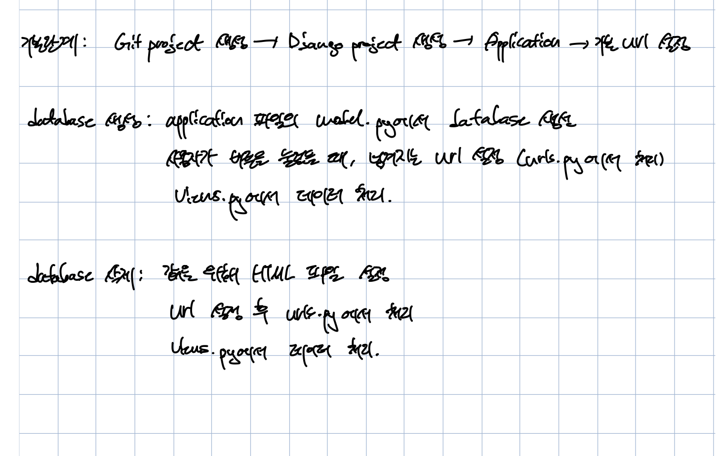 Django를 처음 배울 뿐만 아니라 git 프로젝트를 처음 사용해보았기에 어려움이 많았다. 따라서 파일의 구조와 그역할에 대해 이해하는 것이 중요하다고 생각이 들어 각각의 디렉토리와 그 디렉토리의 생성, 역할을 정리하기 위해 필기를 진행하였다. 필기를 보면 민트색은 Django로 생성한 최상위의 파일을, 그 밑에 연보라색은 하나의 프로젝트 안에 속해있는 Application 파일을 의미한다.