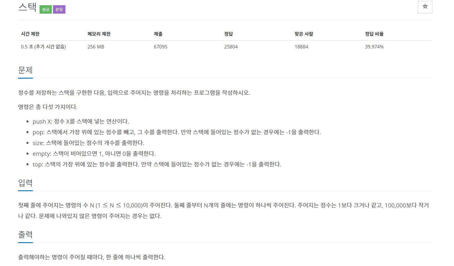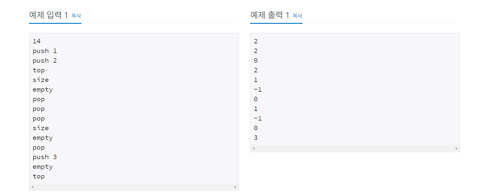 보다시피 기본적인 스택 연산을 구현하는 스택 문제이다. 조금 다른 점이 있다면 입력받은 수 만큼 명령어를 받고 명령어를 실행하는 것? 이것을 제외하면 책에서 읽은 (학교에서 배운) 스택문제와 똑같다. 나름 연결리스트를 사용하고 싶었지만, 최대 입력값이 주어졌기에, 배열로 구현했다. 클래스를 사용한 이유는 복습도 하고 클래스 공부도 할겸 ㅎㅎ...... 같은 문제를 연결리스트로 구현한 스택으로 풀어 다시 이 블로그에 올렸으면 좋겠다 ㅎㅎ 다음은 실행결과 예시이다.