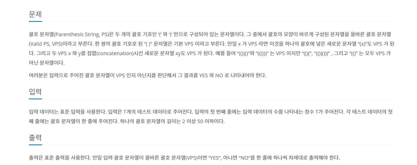 1. 문제, 실행결과 예시 이번 문제는 stack()의 활용 문제이다. 이전 문제(10773번)는 기본적인 스택의 기능을 확인해보는 문제라면, 이번 문제는 스택을 가지고 어떻게 활용할 수 있는지에 대한 문제 같다. (적어도 나의 지식 한에서) 출처: https://www.acmicpc.net/problem/9012 9012번: 괄호 문제 괄호 문자열(Parenthesis String, PS)은 두 개의 괄호 기호인 ‘(’ 와 ‘)’ 만으로 구성되어 있는 문자열이다. 그 중에서 괄호의 모양이 바르게 구성된 문자열을 올바른 괄호 문자열(Valid PS, VPS)�� www.acmicpc.net 다행이도 소괄호만 해당하는 괄호 문자열을 다루는 문제였다 ㅎㅎ 사실 전에 중괄호와 대괄호까지 다뤄보는 문제를 마주친..