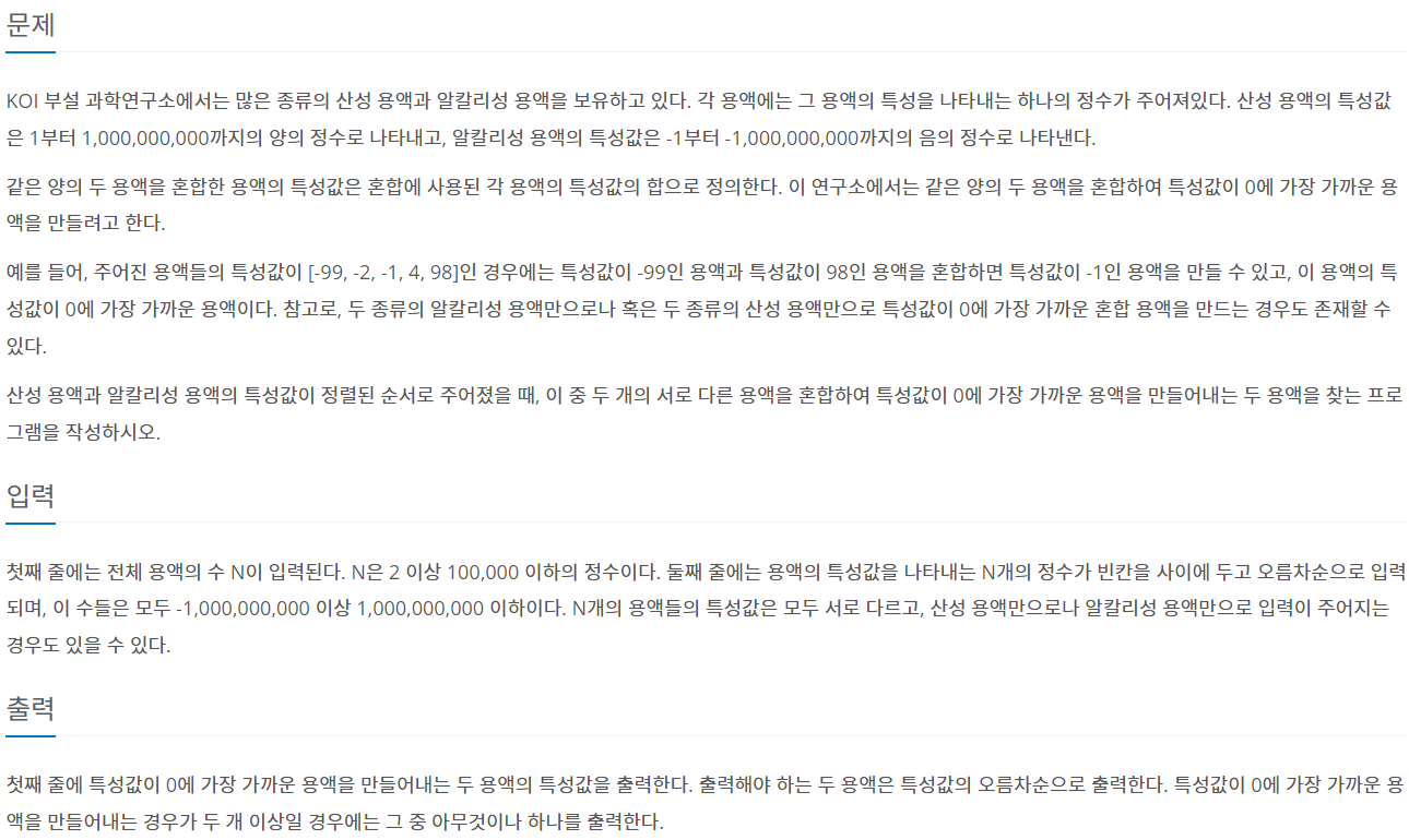 1. 문제 및 예시 실행 결과 투 포인터를 활용하는 문제... 나름 재밌었다. 보통 이런 경우는 이분탐색 처럼 구현을 하게 되는데 그 과정은 어렵지 않지만 어떤 문제로 접근해야하는지 찾는 과정이 이분탐색 혹은 투 포인터 문제의 핵심이라는 생각이 든다. 출처: https://www.acmicpc.net/problem/2467 2467번: 용액 첫째 줄에는 전체 용액의 수 N이 입력된다. N은 2 이상 100,000 이하의 정수이다. 둘째 줄에는 용액의 특성값을 나타내는 N개의 정수가 빈칸을 사이에 두고 오름차순으로 입력되며, 이 수들은 모두 - www.acmicpc.net 2. 풀이과정 문제를 잘게 나눠봤다. 1. 입력 2. 이분탐색 진행 왼쪽과 오른쪽으로 부터 시작하여 두 값의 합이 0보다 크면 음수쪽이..